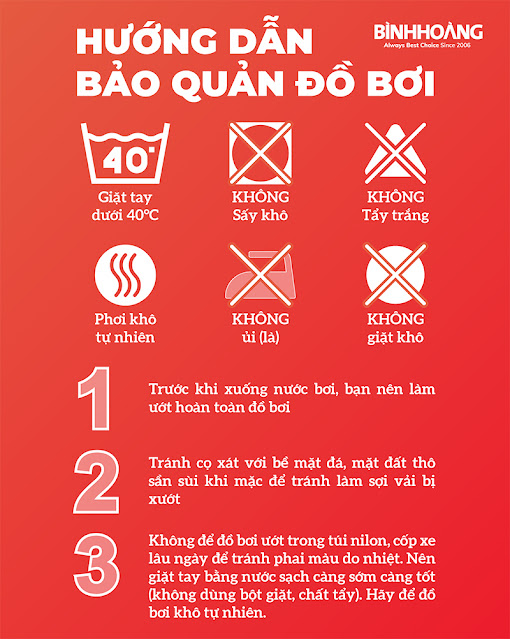 Không để đồ bơi ướt trong túi nilon, cốp xe lâu ngày để tránh phai màu do nhiệt. Nên giặt tay bằng nước sạch càng sớm càng tốt (không dùng bột giặt, chất tẩy) và để trong Balô hoặc túi đựng đồ bơi chuyên dụng. Hãy để đồ bơi khô tự nhiên.